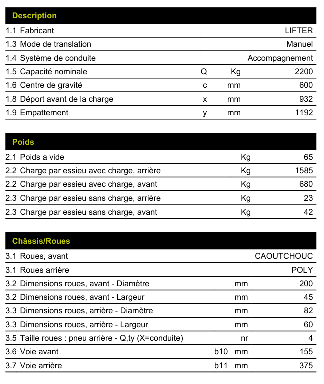 | Capacité nominale | 2200kg |