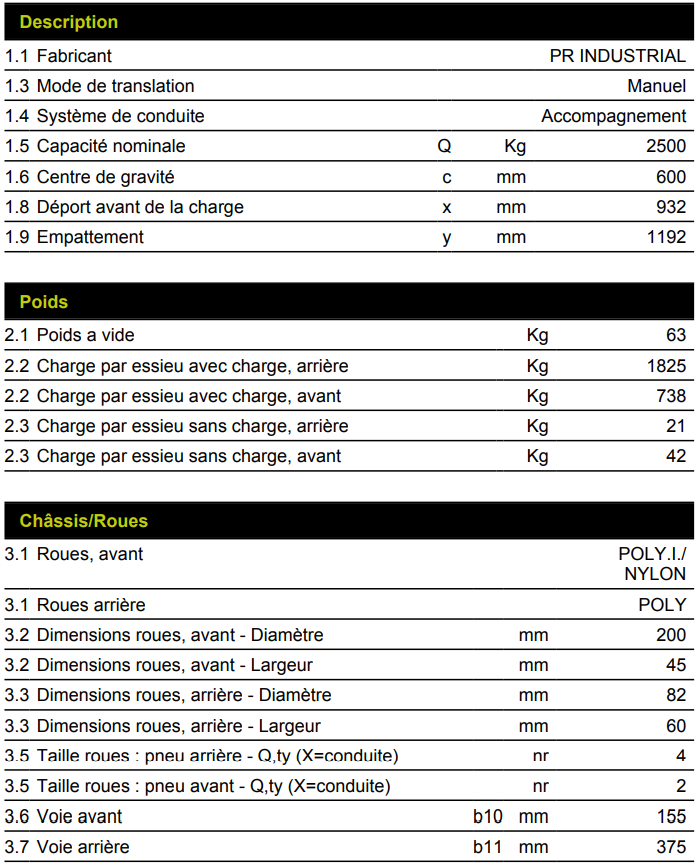 | Capacité nominale | 2500kg |